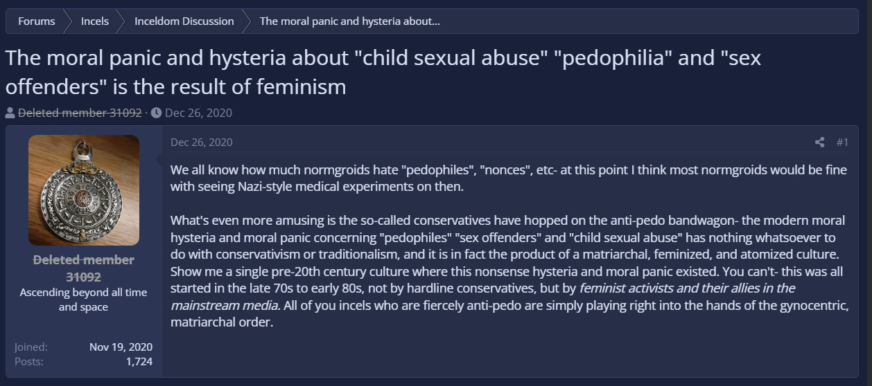 Users of incels.is and Looksmax.org also frequently advocate for pedophilia and child sexual abuse. Child pornography has been posted to these forums on several occasions before being moderated and removed. Other non-pornographic material in which underage girls are sexualized and degraded is far more common. This type of content is often posted in an effort to persuade incels that pedophilia and hebephelia are practical solutions to their involuntary celibacy.