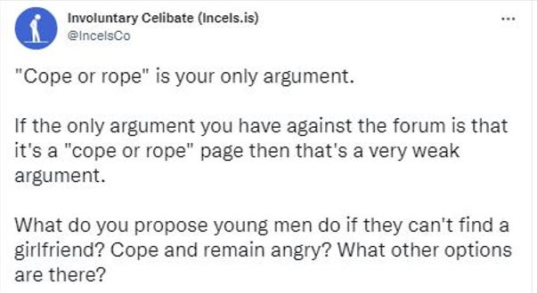 In another notorious tweet, Lamarcus Small boiled down the options available to incels as “cope or rope.”