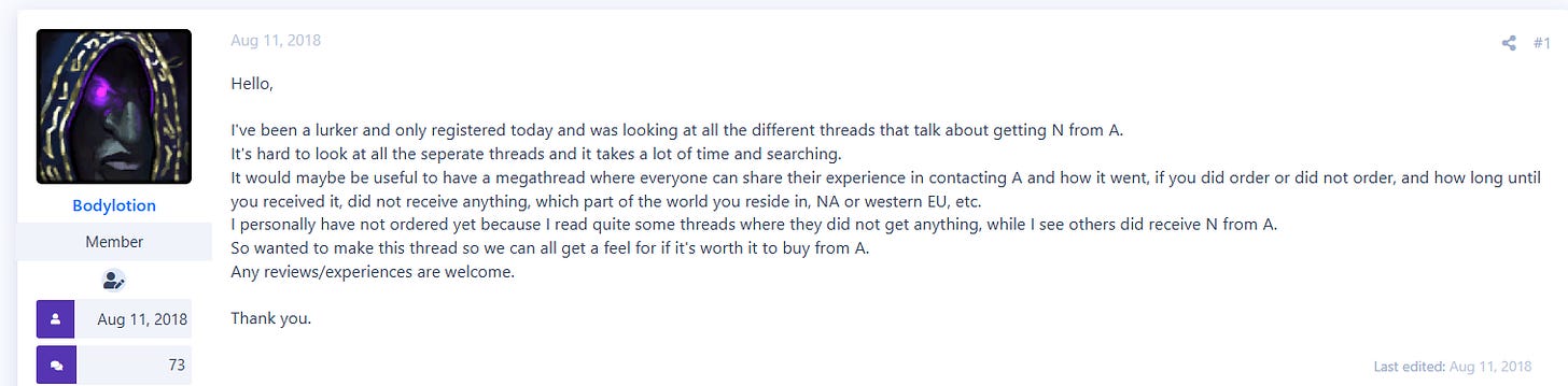 The incel/looksmaxxing rabbit hole is a very dark one given the connection to the suicide-for-profit website, Sanctioned Suicide. Sanctioned Suicide, also founded by Small and Galante, is an internet forum known for suicide discussion and encouragement. Small and his supporters try (poorly) to pass the website off as a place for honest and open discussion of suicide, but in addition to posting detailed instructions, tips, and stats on various suicide methods, Sanctioned Suicide is also home to “sellers” of poison and suicide kits, which they peddle to people at their lowest in hopes of turning a profit off of their deaths.