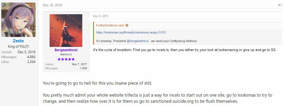 Posts on Small’s sites – particularly incels.is and looksmax.org, are often labeled with the tag “suicidefuel” as an indicator that the poster is contemplating suicide. Suicide threats are extremely common on the forum. In response, comments from “super-users” and even site moderators have been known to advertise Sanctioned Suicide in a sick cross-pollination scheme that has sent more than a couple of incels to their ultimate deaths by suicide. Some users also urge suicidal members to film their deaths or commit suicide while live in Discord calls. At least one prolific user of incels.is was known to be an O9A satanist intent on selling the idea of ritualistic murder and suicide to incels.