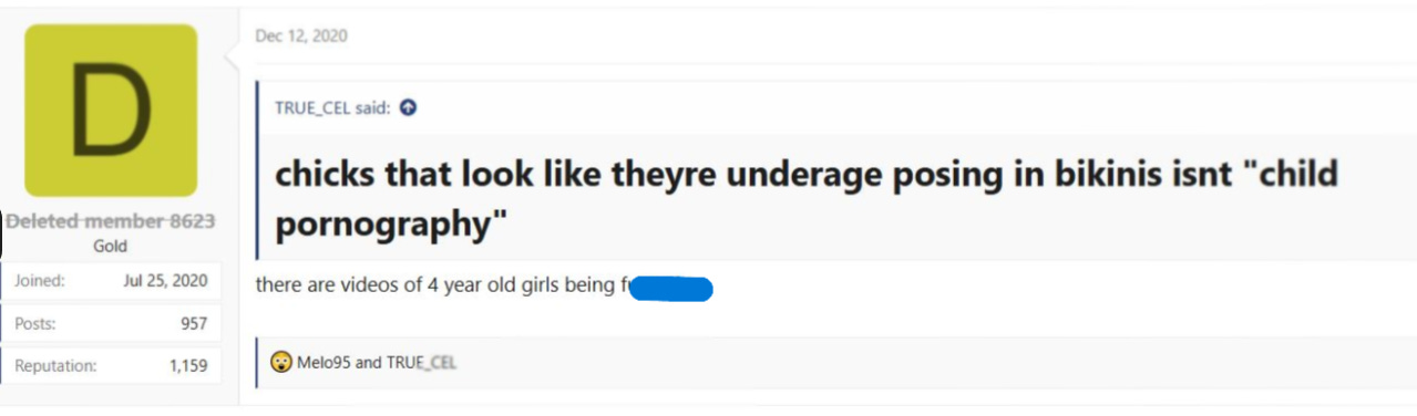 Another Looksmax thread from December of 2020 laughingly discussed the presence of “girls” on the site rapey.su, and confirmed there was child pornography on the site as well. A super user and moderator of both incels.is and Looksmax.org named “True-Cel” tried to defend the photos on the site as being simply “chicks that look like they’re underage” to which another user replied that the link contained videos of 4-year-old girls being sexually assaulted.